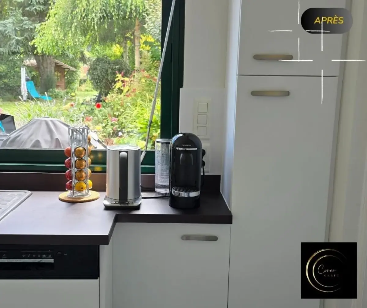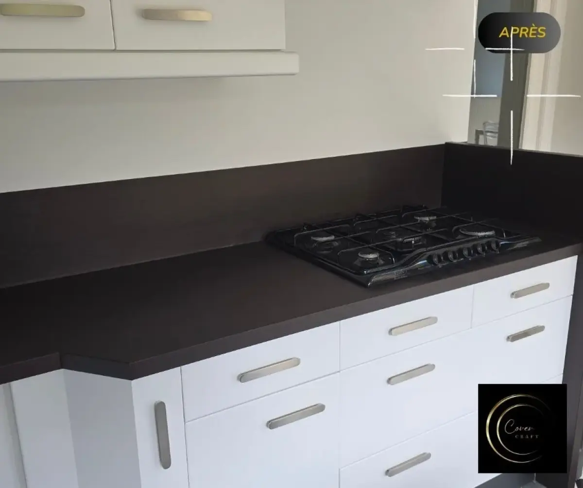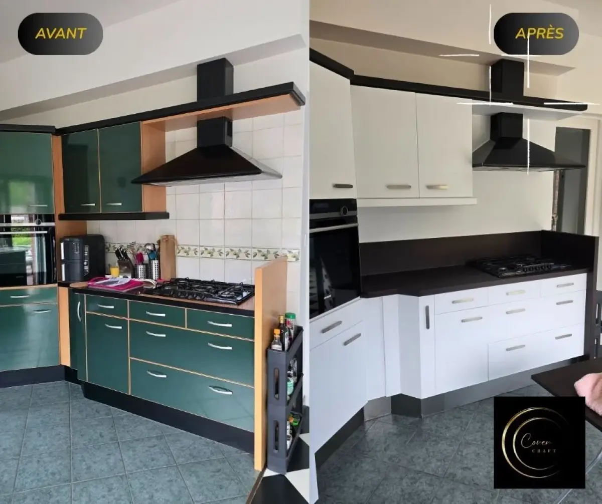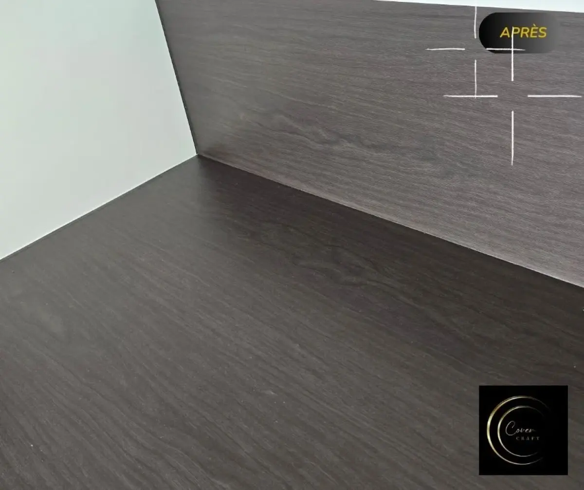 Découvrez la métamorphose de cette cuisine réalisée par Cover Craft : une rénovation complète sans travaux lourds grâce au covering professionnel, à la création d’une crédence sur-mesure en MDF, et à des finissions premium comme les plinthes en effet inox. Une solution durable, moderne et économique.
